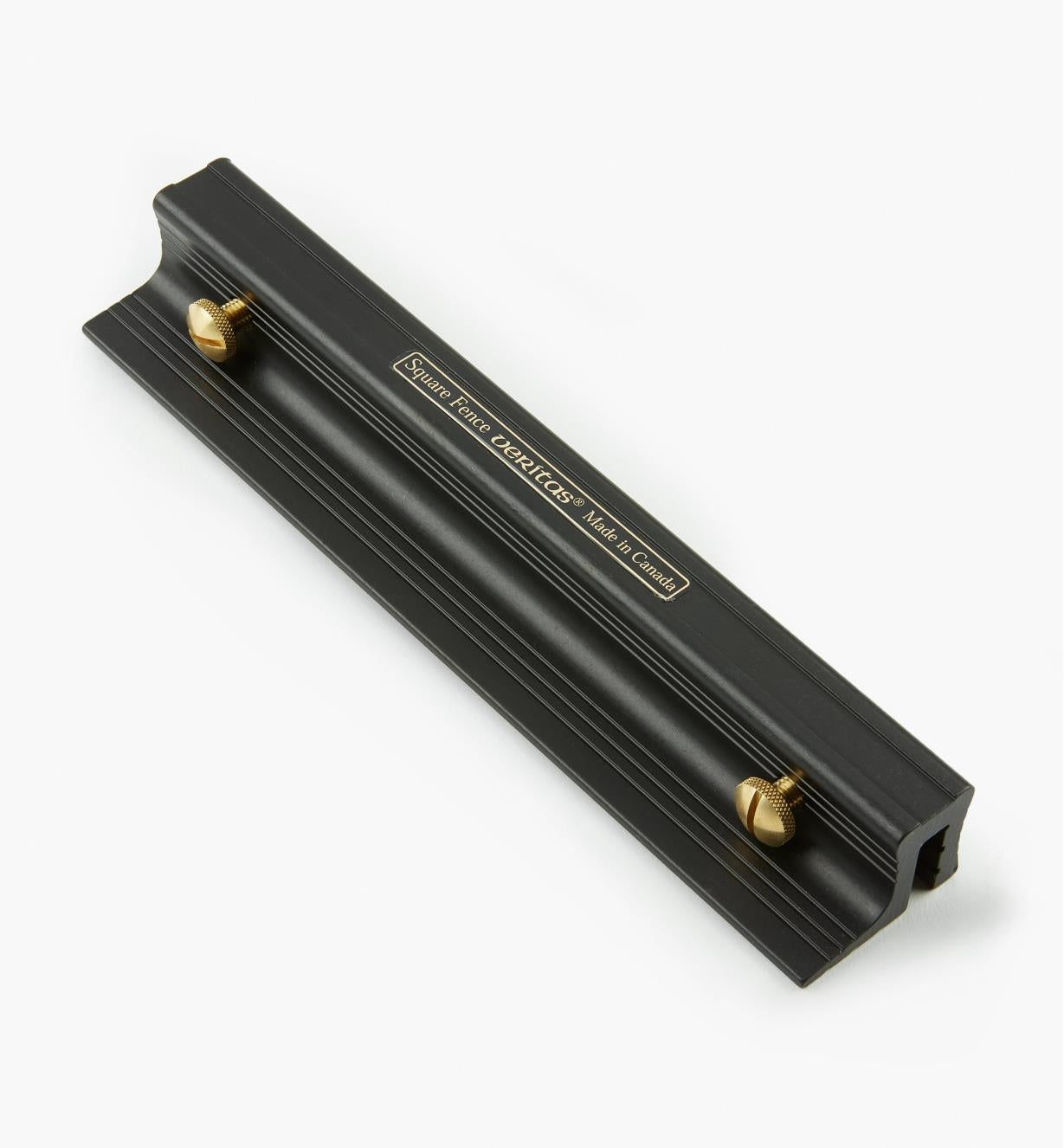 The 8" long anodized aluminum extrusion can be readily attached to either the stock or blade of your square (depending upon intended use) with the two integral brass screws. The face of the square fence aligns with the edge of the workpiece while the weight of the framing square rests on the material.