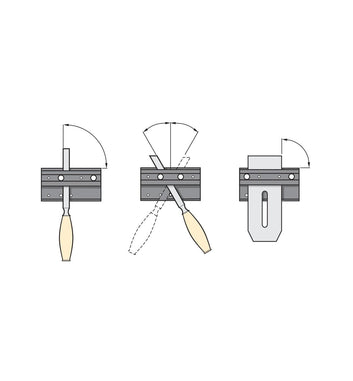 Put a tool in the jig, slide it against the alignment pin and one clamping thumbscrew to square it, adjust the blade projection for bevel angle, and tighten in place. The tool is now held squarely in the jig at the chosen bevel angle. Slide the jig back and forth across the tool rest and stone face to sharpen the tool.