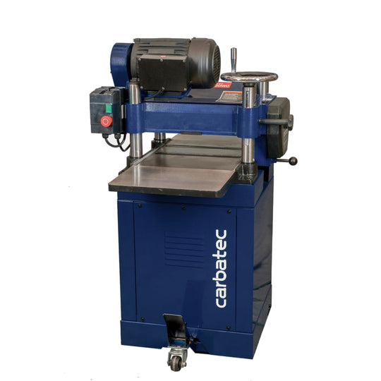 Professional Thicknesser (+ optional Stand? + optional Infeed and Outfeed tables?)Hang on a second!These important components SHOULD be included, yes? Well, we agree, and that's how we do it. Why pay for add-ons that should already be part of a professional cast iron workshop machine? We even include the integrated swivelling wheel kit an industrial magnetic contactor for good measure!Another great feature with this machine is the fixed table height. The cutterhead (not the table) is mounted on four heavy duty steel posts that move up and down using the large diameter steel handle for precise and accurate planning, this means the cast iron bed remains at a constant height, allowing for infeed and outfeed tables to be aligned with longer in/outfeed roller benches. The precision machined and polished tables allows the workpieces to move freely over them, and thier heavy cast iron construction reduces the chance of vibration, therefore giving an overall better finish. Far from a portable machine, this 200+kg unit is a fantastic unit for the price! This machine has a powerful 2,200W motor powering a 3-knife cutterhead, serrated infeed roller, polyurethane outfeed roller, anti-kickback fingers, cast iron table and adjustable bed rollers. The TH-381P also has two feed speeds to improve the finish on both soft and hard timber, anything up to 380 mm wide x 170 mm thick!It is highly recommended that a 2HP dust collected be paired with this machine to ensure peak performance. As a large 3HP unit, a 15amp circuit is required for this machine. Customers in New Zealand - please note that features on machinery sold in NZ may vary with photos shown. Click here for more information regarding cutting hardwoods or softwoods with any woodworking machine.