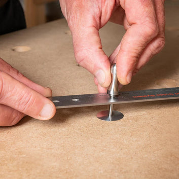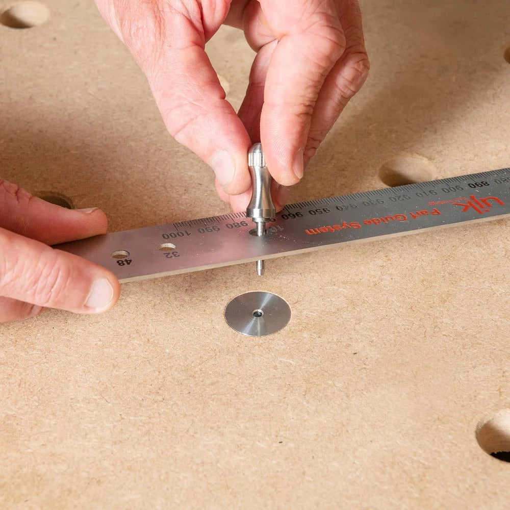 The UJK Parf Revision Dogs is a set of three aluminium dogs, similar in design to UJK Parf Anchor Dogs, but in this case, each with a central 3mm hole. The 3mm holes provide accurate registration points for further expansion of the grid pattern on an existing multifunction bench top using the UJK Parf Guide System. Parf Revision Dogs form a precise reference point for additional 20mm dog holes.