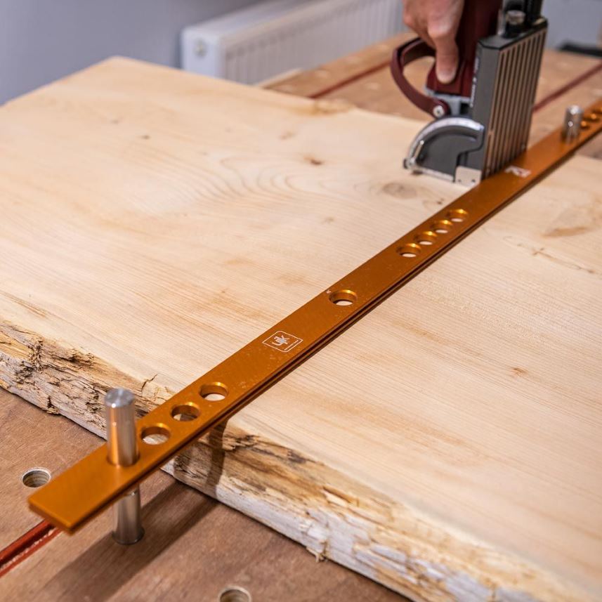 The fence can be used over the top of the workpiece, e.g, laying out dominoes/biscuits or machine ingrooves with a router. The fence allows 840mm material to pass underneath between the dogs. It has an additional hole for setting at 45°. The more you use this piece of equipment the more uses you will find for it.