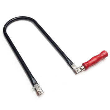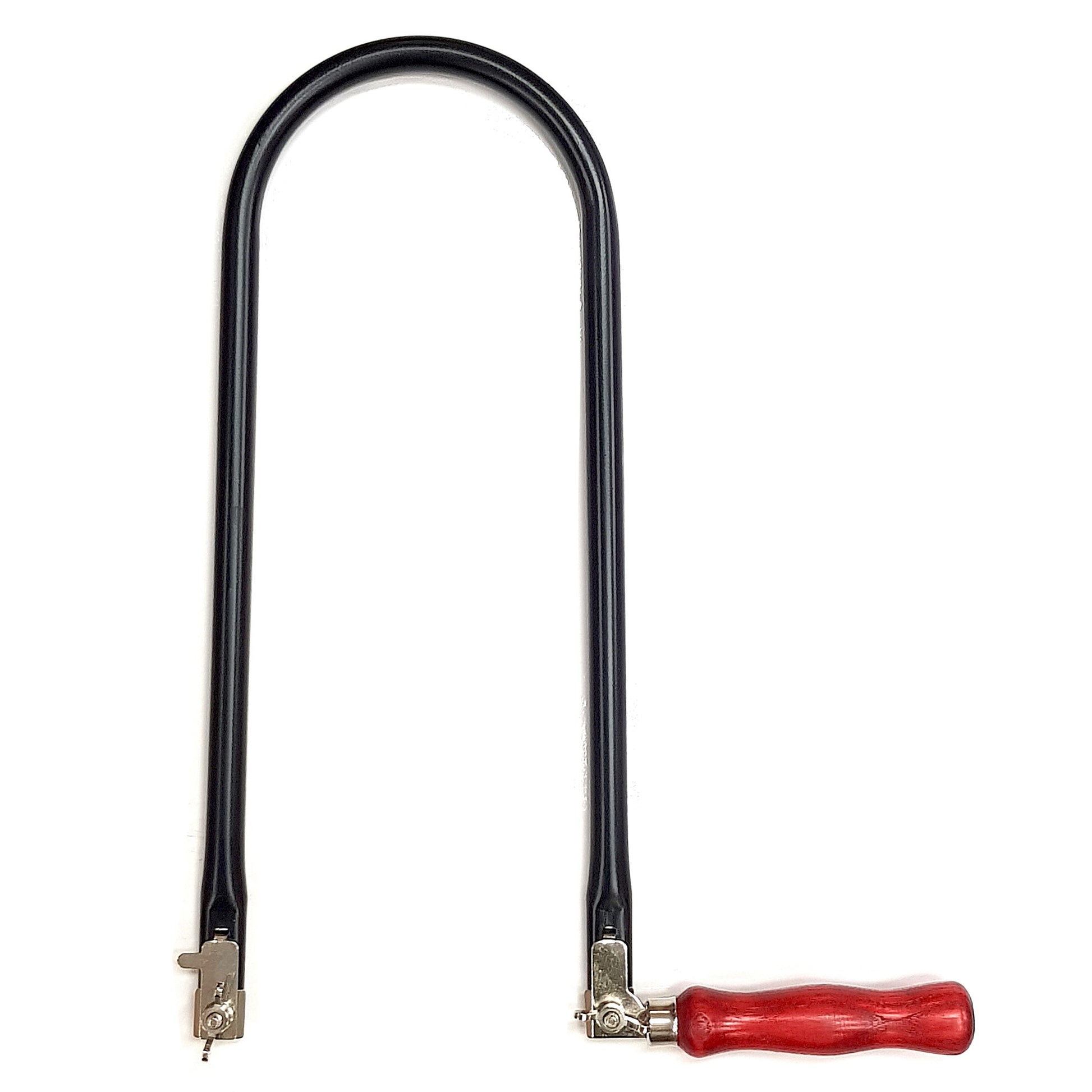 This saw is very solid in construction, made of 13mm round steel coated black. With a comfortable solid Beechwood handle stained red, this saw features a 320mm frame/cutting depth.Basic clamping heads are suited to plain end blades (no pins) of 130mm length - such as our extensive range of premium quality Pegas scroll saw blades.A useful and versatile deep cutting hand saw.*NB: Blade not supplied. See our extensive range of Pegas Scroll Saw Blades.