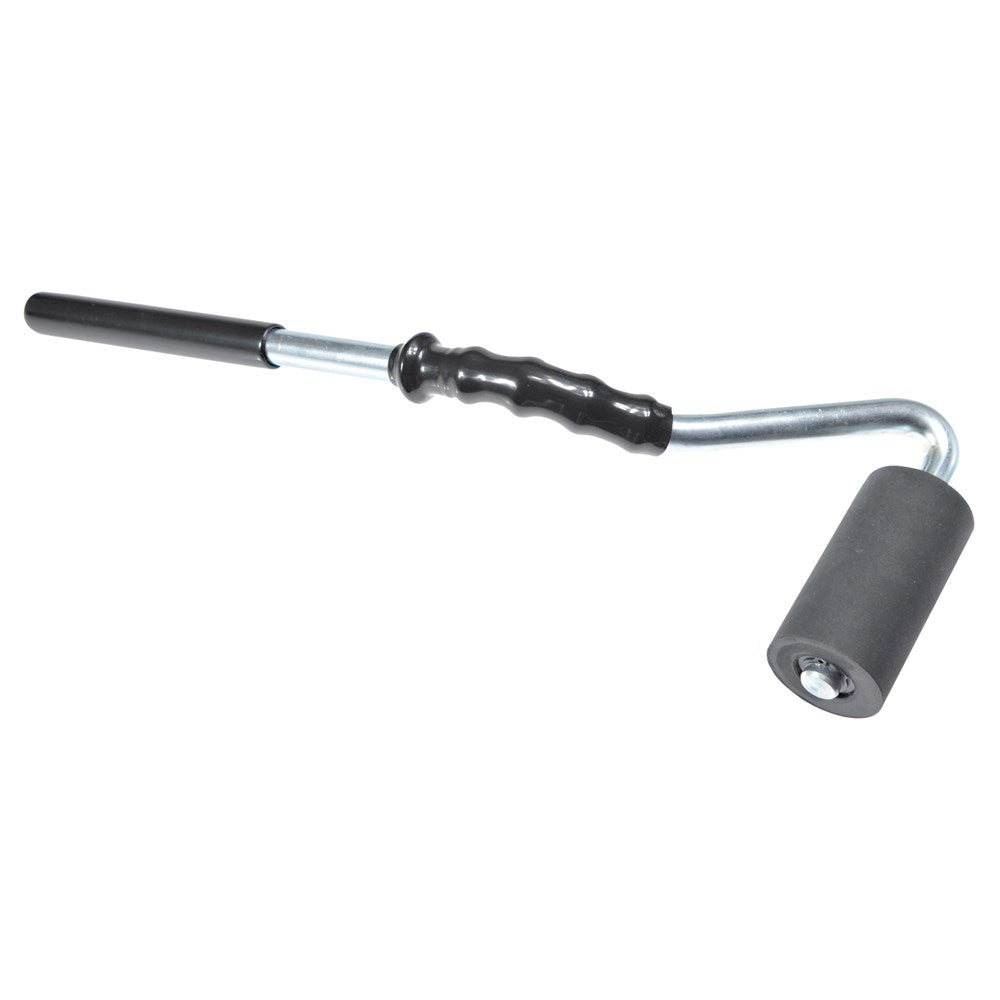 A heavy duty; high quality veneer roller. A cranked-neck solid steel shaft allows you to apply heavy pressure while keeping your hands free of the workpiece. Comfortable grips allow you precise control over the 75 mm wide rubber roller. Overall length: 350 mm with a 100 mm deep offset crank shaft. Weight: 650g