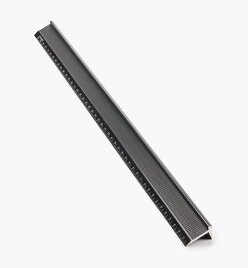 These Veritas rules have an acute interior angle to ensure that they seat well, even over saw whiskers, and bevelled edges with etched graduations to minimize parallax errors. The great advantage of this style of rule is that it saddles the edge of a workpiece, making it easy to hold accurately in position when measuring and marking layout lines. This design also simplifies transfer of perpendicular lines from face to edge and is particularly convenient when holding and marking off dowel rod stock.