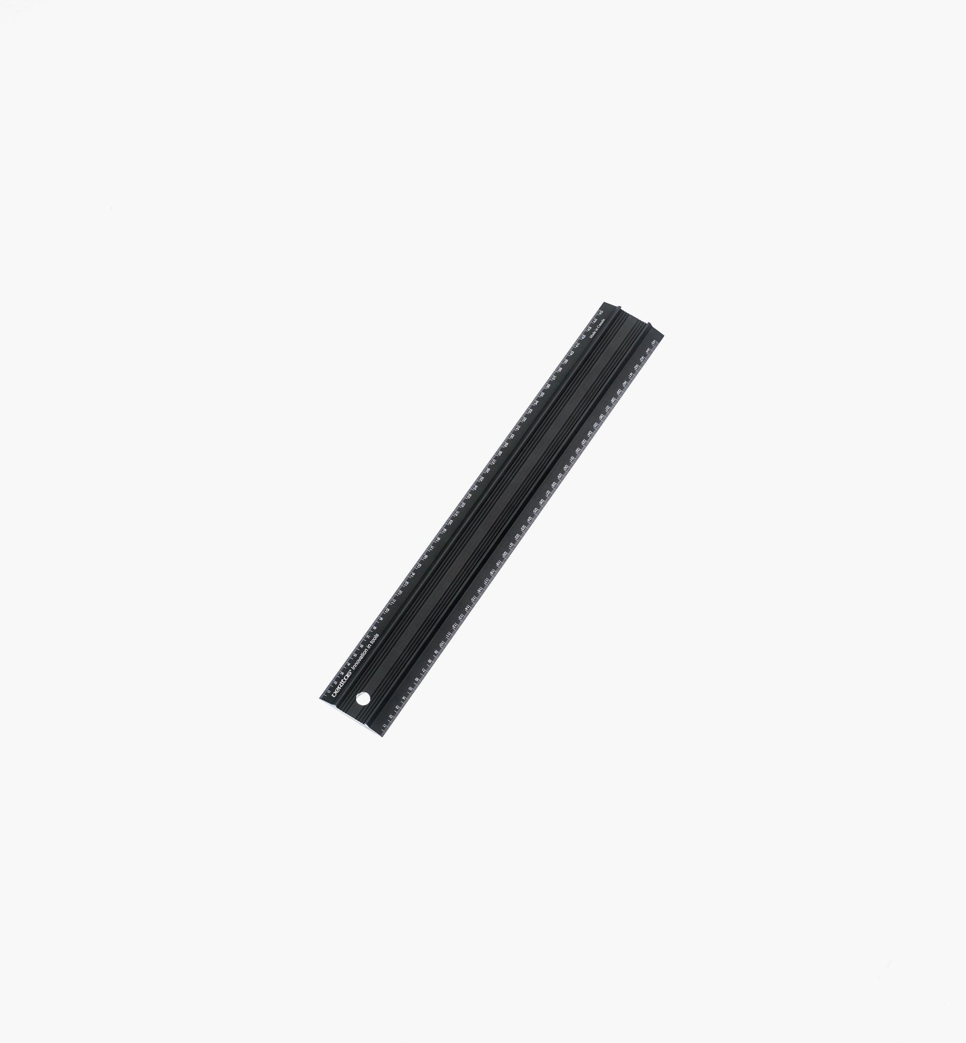 Cut from a 63.5mm (2-1/2") wide solid aluminium extrusion, it has fine laser-etched markings that stand out clearly against the matte black anodized finish. Graduated in millimetres, one edge reads right to left and the other left to right.