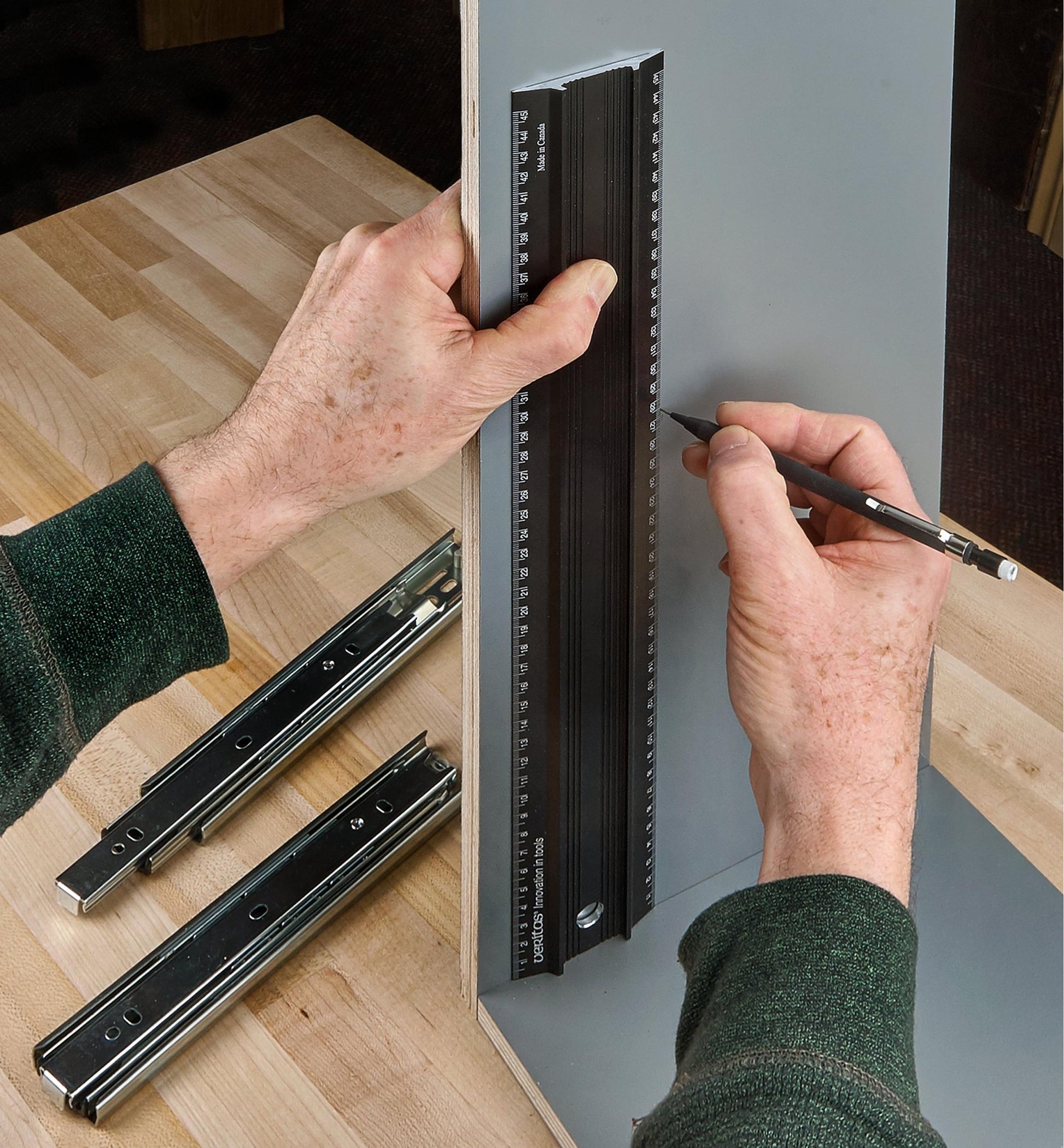 The broad profile makes it easy to plant a hand comfortably, while the protruding ribs ensure a slip-free mechanical lock. The rule also butts nicely against a fence for setting blade offsets and is wide enough to provide a vertical register in use.