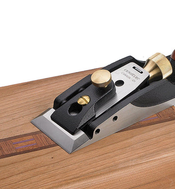 Four set screws accurately register the blade in the body, and it has a large thumb wheel for depth adjustment. Comes with a lapped O1 steel blade hardened to Rc58-60. The 20° bevel blade coupled with the 15° bed angle yields an effective cutting angle of 35°, severing end-grain fibers cleanly and minimizing tearing. Weighs 1.2 lb.
