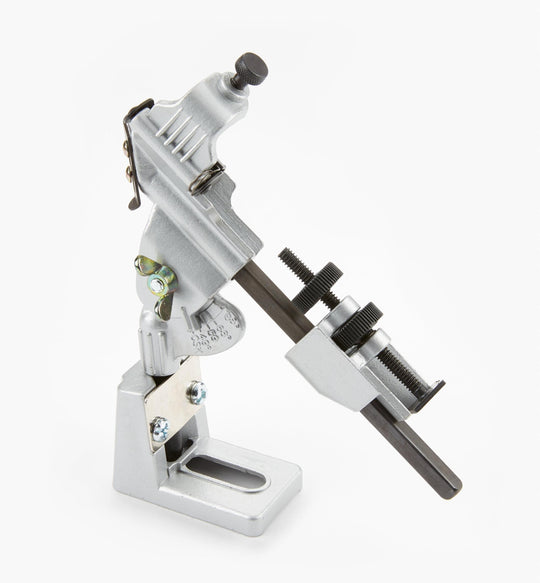 This bench-mounted drill grinding guide is used with a standard electric bench grinder. Sharpening drill bits has never been so easy. Twist drills bits from 1/8" to 3/4" in diameter can be sharpened on the side of the bench grinder. It will grind all angles, providing an edge relief as it grinds on an arc.