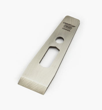 The PM-V11 steel blade is just under 7/8" wide. It has a 20° bevel angle; combined with the plane’s bed angle of 15°, this gives it an effective cutting angle of 35°.