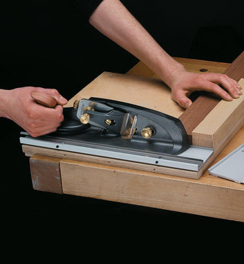 The body is fully stress-relieved, ductile cast iron, with a sole and running surface machined flat and square to one another; the 2 1/8" wide running surface fits the classic Stanley #52 chute board. Three set screws let you compensate for slight inaccuracies in a wooden shooting board by adjusting the blade square to the workpiece.