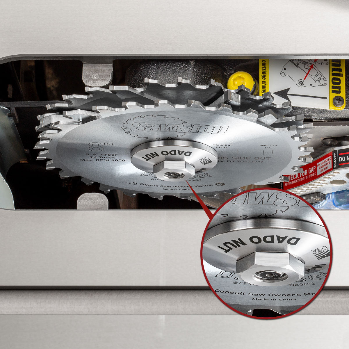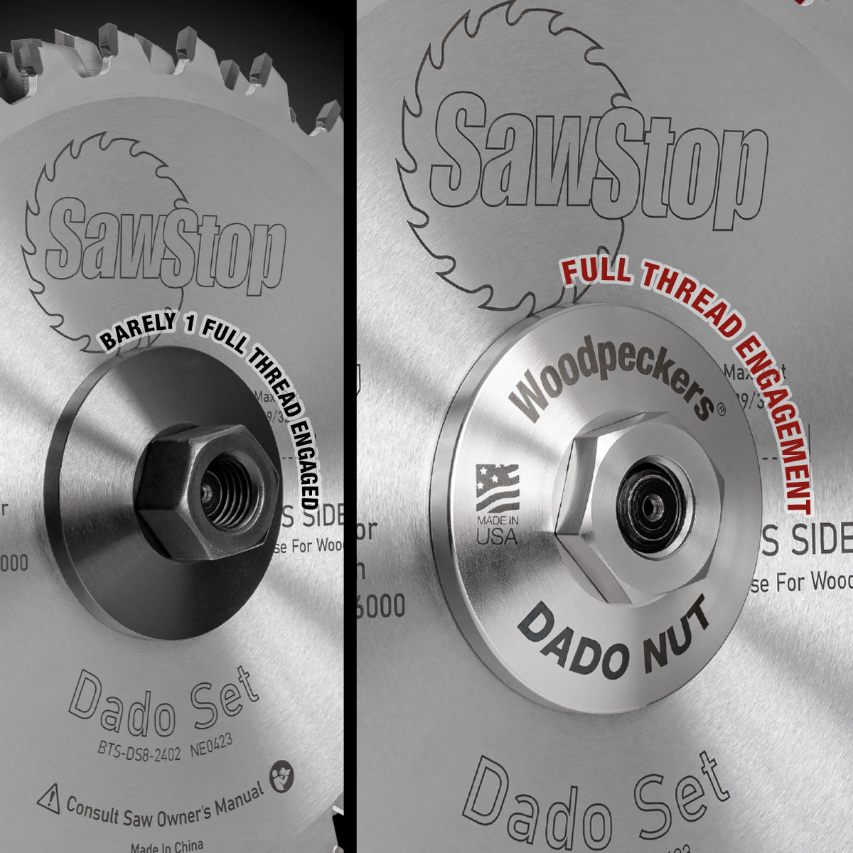 Dado Nut merges the arbor washer and arbor nut into one integrated unit. The threads extend almost completely through the arbor washer, and the nut is conveniently retained within the washer. Now you have the stability of a carefully machined arbor washer AND full thread engagement of the arbor nut when using a full dado stack.