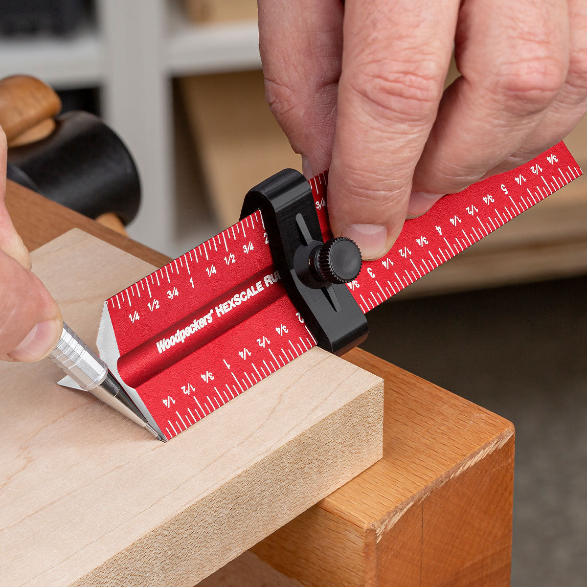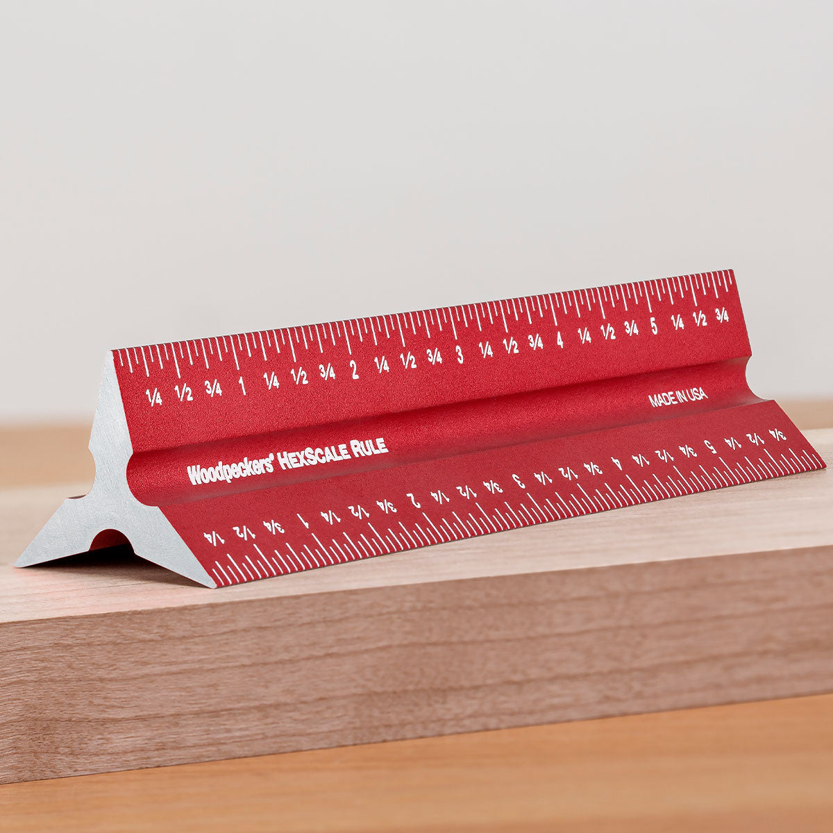 Wouldn't it be great to have one rule you could grab knowing you could reference from either end, measure in either inches or millimeters and locate the centre of anything instantly? Well, now you can. Woodpeckers introduces the new HexScale Rulesix different graduations in one handy rule. Those of us old enough to remember when woodworking plans were drawn on a drafting table instead of a computer will also remember a triangular rule that was graduated with several different ratio scales and a normal inch scale.