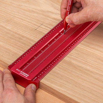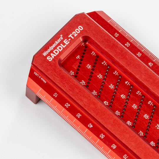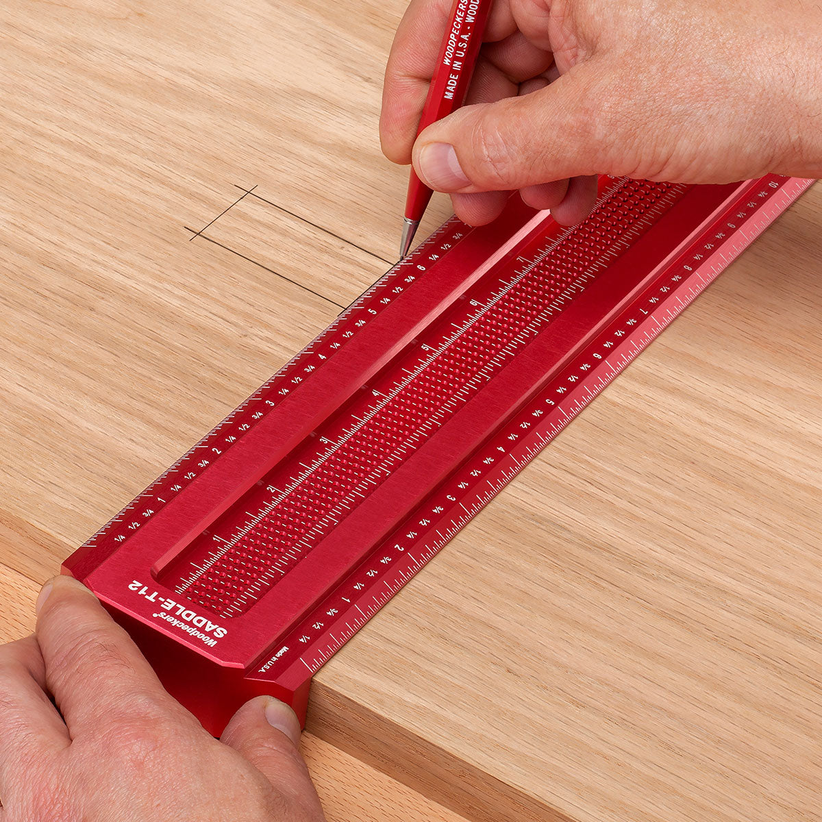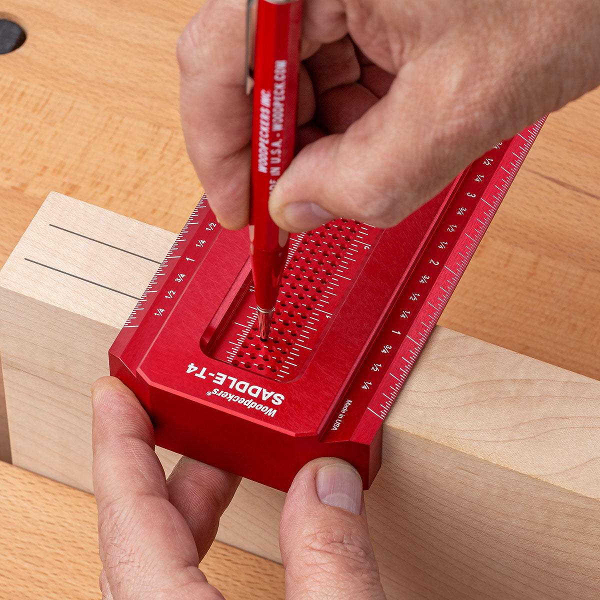 Whether you have 40 years of woodworking experience or 40 hours, those tiny lines on rules and tapes can be difficult to see and even more difficult to transfer accurately to your work. Woodpeckers Saddle T-Squares improve your layout accuracy with three unique features a series of holes to guide your pencil, an edge that wraps around your work, and a high-contrast laser-engraved scale. These three great features are packed into tools that easily drop in your shop apron or carpenter jeans pocket, so you're always ready for precision layout work.