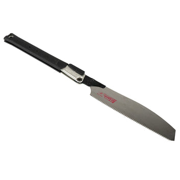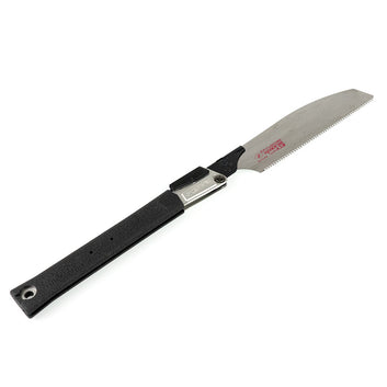 Our 'Next-level' Folding Japanese Pull Saw offering!Zetsaw (Z-Saw) from Japan bring you two New Premium Folding Saws. With a comfortable thick rubberised grip that wraps a solid heavy alloy spine and positive heavy duty locking mechanism, these saws are incredibly effective cutting tools! Cutting on the pull stroke, the extremely sharp impulse hardened teeth provide an aggressive and quick cut that is also extremely fine - they can even plunge cut. These pullsaws would be at home in any handy-persons kit, right through to the fine woodworker. After use, the blade can be safely folded back into the spine for storage or transit. Blade is replaceable and spare blades are available.This is the smaller of the two models. Specifications: